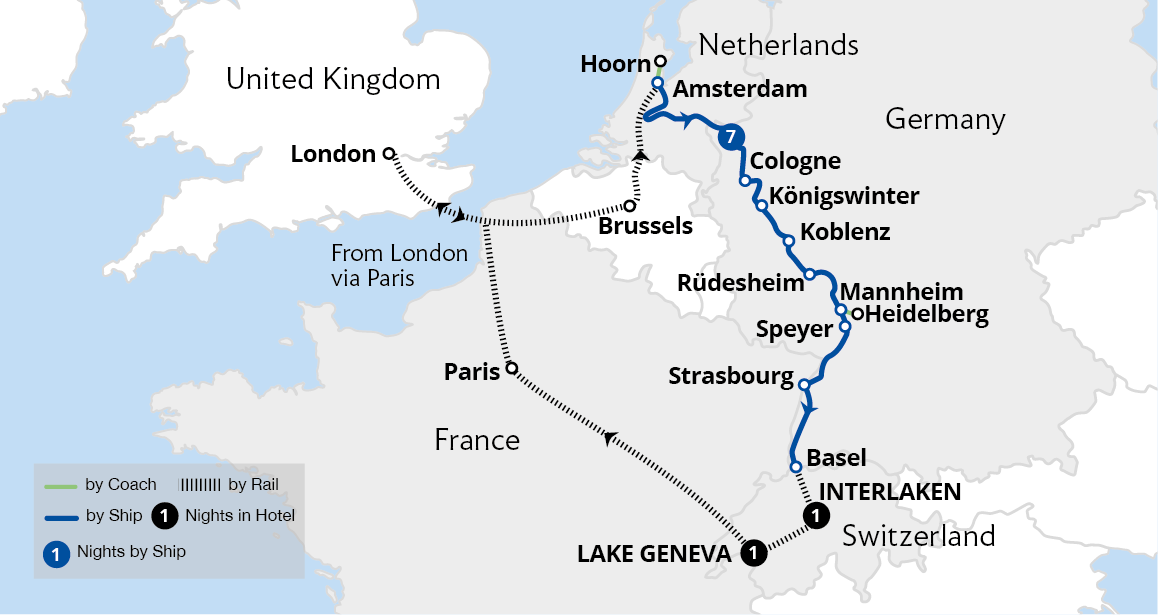 Combine an iconic Swiss rail journey with a cruise along the romantic Rhine. From Interlaken, ride the Jungfrau Express to Europe's highest railway station - an alpine wonderland of glacial ice and snow, set among the mighty Eiger, Mönch and Jungfrau mountains. Next, aboard a luxury ship, visit captivating Heidelberg and Rüdesheim, then cruise...