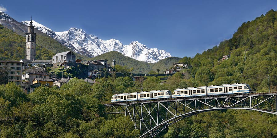 Centovalli means '100 valleys' so it's no surprise that this aptly named line traverses an abundance of photogenic scenery. Clear lakes and the backdrop of the Alps frame this railway's vistas to perfection.  The line winds its way to Locarno, a quaint town characterised by narrow streets and grand Alpine views which complement the architecture of Locarno's Old Town admirably.